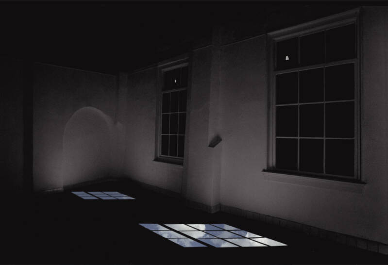 The outlines of the sunlight which shines on the floor are painted white. A Camera Obscura is installed and projects the clouds passing by on the white faces. They suggest height and at the same time, depth underneath the floor.